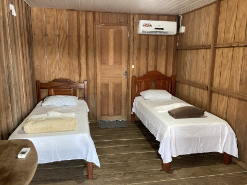まず客室に案内された。昨年と同じ造りの部屋だった。ベッドが二つ並んだ寝室にはエアコンがあり、その奥に水洗トイレと洗面台、シャワーが設けられていた。Wi-Fiも繋がるのでとても快適だった。このロッジの客室は二人部屋が基本だ。今年は部屋もボートも一人が良いとホフマンにお願いして割り増し料金を払って一人部屋にしてもらった。