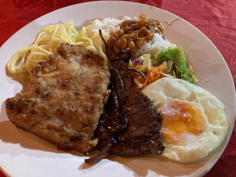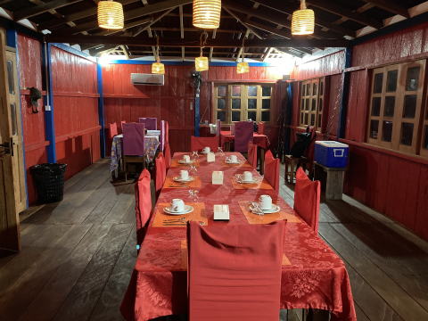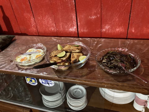 20時から夕食をとった。このロッジの食事はビュッフェスタイルだ。食堂のサイドテーブルに米飯、パスタといった主食と米飯にかけるスープ、サラダなどの野菜料理、そして主菜の肉料理と魚料理が大皿に盛られて並び、それを各自が食べたい分だけ皿に盛るスタイルだ。この日の主菜は牛肉のソテーとピラルクーのフリットだった。飲み物は水、ソフトドリンク、ビールが追加料金不要で用意されている。ビールを飲みながらおいしい料理に舌鼓を打った。夕食後は部屋に戻ってタックルを準備し翌日からの釣りに備えて早めに就寝した。