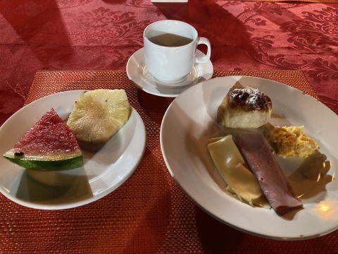 時差の関係か3時頃目が覚めた。5時過ぎに起床して釣り支度を整え6時から朝食をとった。外はまだ暗かった。