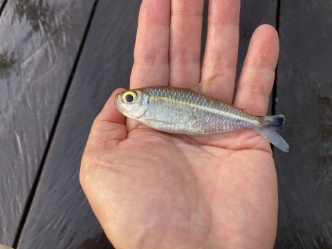 明るくなり始めた6時30分頃から桟橋で小魚釣りをした。ピアバやピラニアが釣れた。