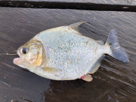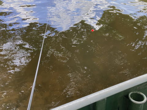 14時に午後の釣りを開始した。まずミミズ餌を使ってナマズを狙った。アタリを待つ間はライトタックルを使ったブッコミ釣りでナマズ釣りの餌に使う魚を釣った。ナマズのアタリはなかったがライトタックルではパクーが立て続けに釣れた。