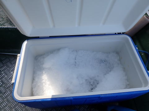 ボートに積まれたクーラーボックスには氷がぎっしり詰まっている