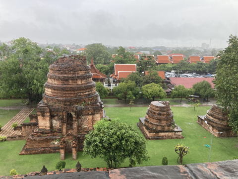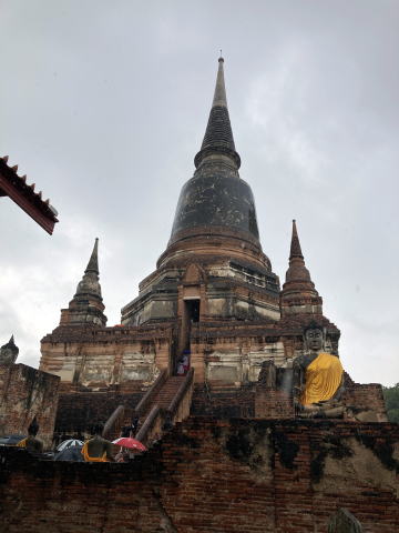 最初の訪問先はワットヤイチャイモンコンだった。傘を差して見学した。ここでは仏塔に上ることができた。