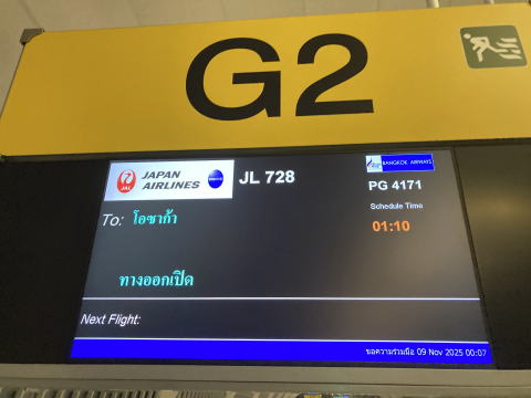 日付が変わった11月9日の1時に搭乗し1時30分にスワンナブーム空港を後にした。機内では寝て過ごした。翌朝8時に関西空港に着陸した。9時過ぎの特急で新大阪駅に移動し、新幹線に乗り継いで帰宅した。