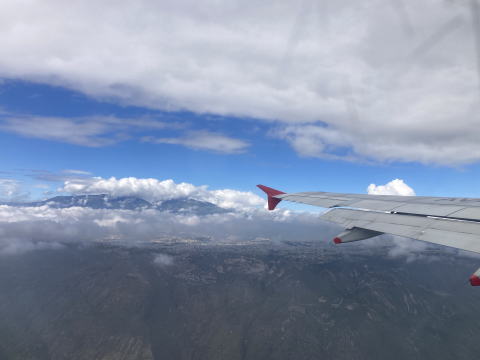 ガラパゴス諸島のバルトラ空港行きの飛行機は9時30分にキト空港を離陸した。離陸直後には山々に囲まれたキトの街並みが見えた。1時間ほどすると眼下に太平洋の海面が広がった。