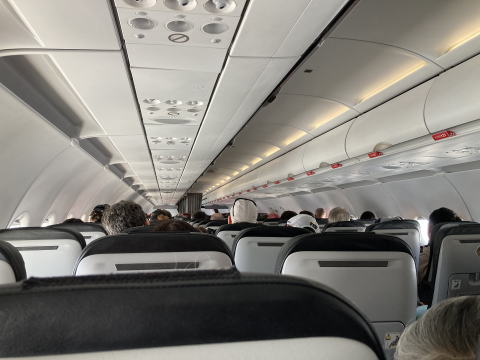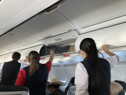 着陸前に頭上の荷物室の消毒がおこなわれた