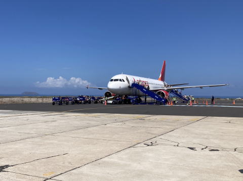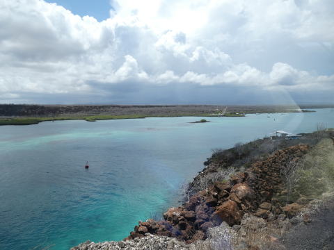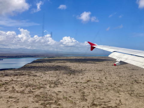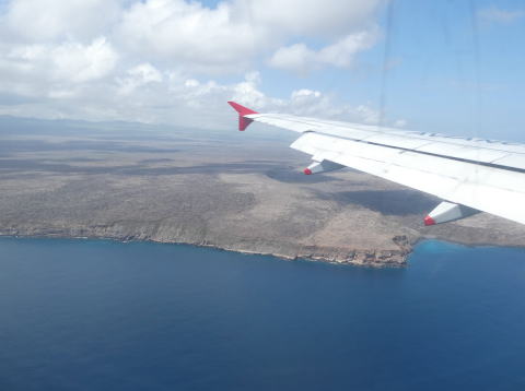 離陸後2時間ほどたって降下を始めると島が見えてきた。ガラパゴス諸島だ。胸が高まった。搭乗機はそのまま着陸体制に入ってバルトラ空港に着陸した。エクアドル本土とガラパゴス諸島の間にはー1時間の時差がある。到着時刻は10時30分だった。