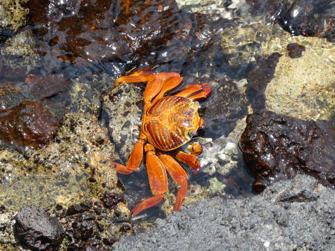 桟橋でフェリーを待っている間にもフィンチやガラパゴスベニイワガニなどガラパゴス諸島固有の生き物の姿を見ることができた。