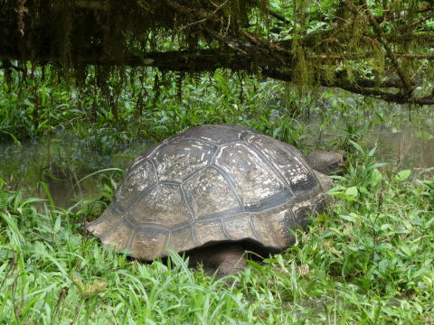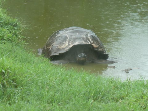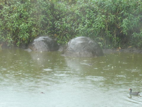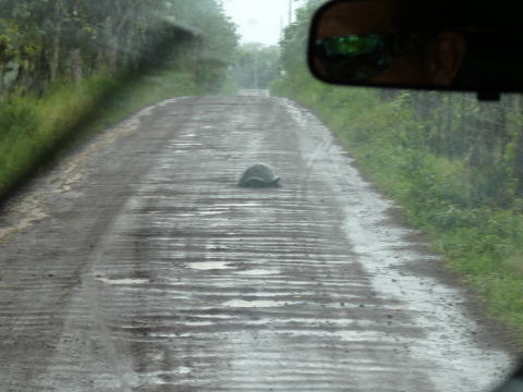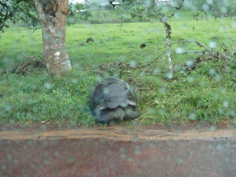 雨で視界が悪くなったバスの窓から道路脇を眺めていると大きなカメが視界に飛び込んできた。ガラパゴスゾウガメだ。夢中でカメラのシャッターを切った。