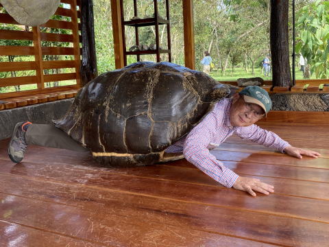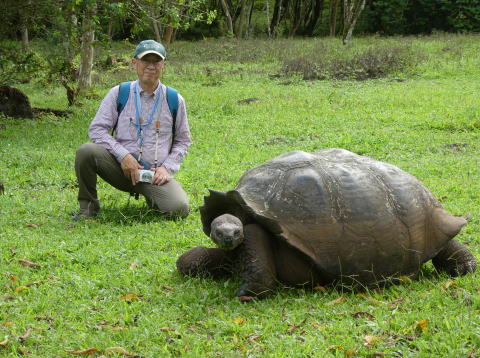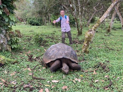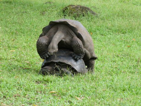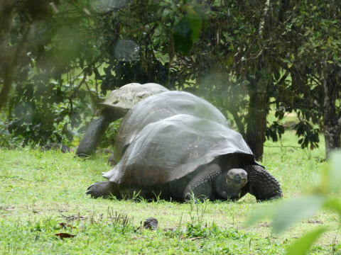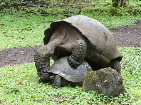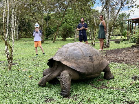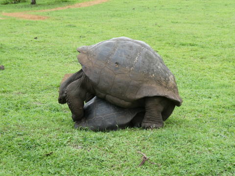 昼食後はガイドの案内で農場内を歩いてゾウガメの観察をおこなった。繁殖期が始まったタイミングだったのであちこちで雌に交尾を迫る雄のゾウガメの姿を見かけた。ゾウガメの背後に回り込んでツーショット写真を撮ることもできた。