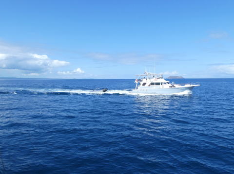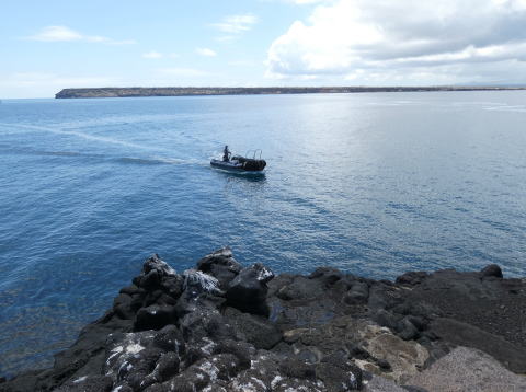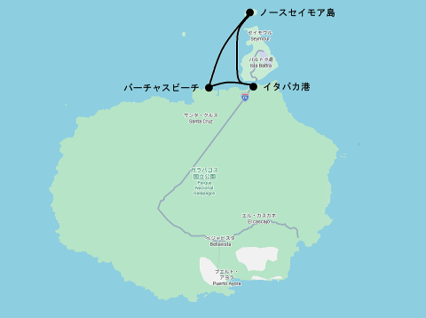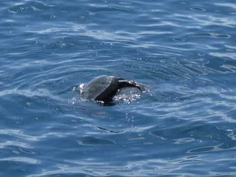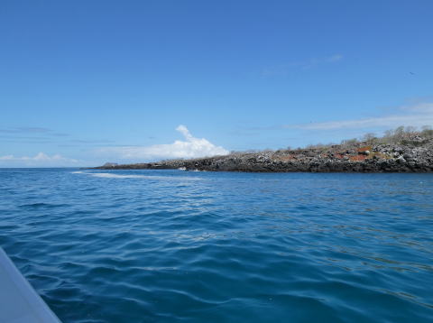 この日の目的地であるノースセイモア島はイタバカ港の目前に見えているバルトラ島(旧名サイスセイモア島)のすぐ北側にある島だ。航行予定時間は45分ほどだった。この日もトップデッキのシートに座って海鳥やウミガメなどの生き物を探しながらクルーズを楽しんだ。岩場にとまるアオアシカツオドリや海面で交尾しているウミガメの姿を見ることができた。