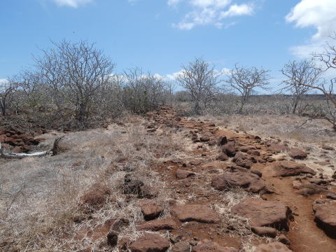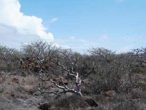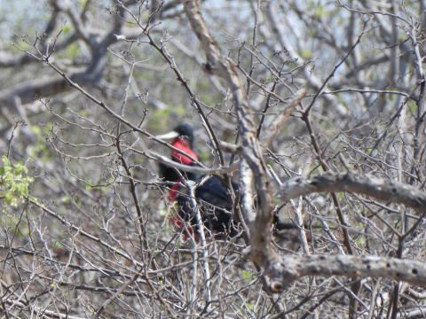 上陸してトレイルを歩き始めるとすぐにブッシュの奥で喉袋を広げているグンカンドリの姿を見ることができた。望遠レンズで撮影を試みたが手前のブッシュにピントが合ってしまい上手く撮影できなかった。残念だった。