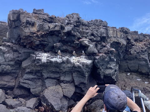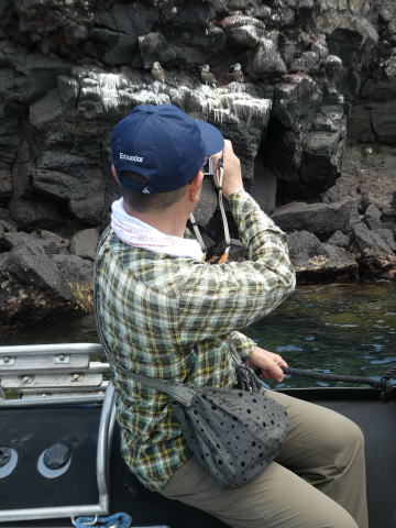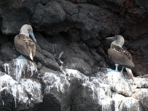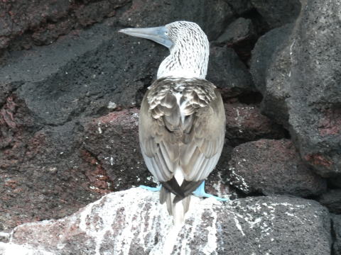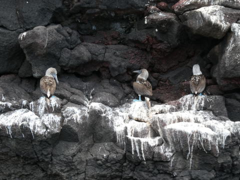 ゴムボートに乗り込み島を後にした。ボートはクルーザーにまっすぐ戻ることはせず海岸沿いを進んでいった。200mほど進んだ地点でガイドが崖の窪みにいた鳥を指さしてブルーフットブービーと教えてくれた。そこには3羽のアオアシカツオドリがいた。アオアシカツオドリはガラパゴスで一番人気の高い海鳥だ。間近で見るのは初めてだった。名前の由来通り鮮やかな水色をした足が良く目立つ鳥だった。表情にも愛嬌があった。
