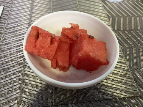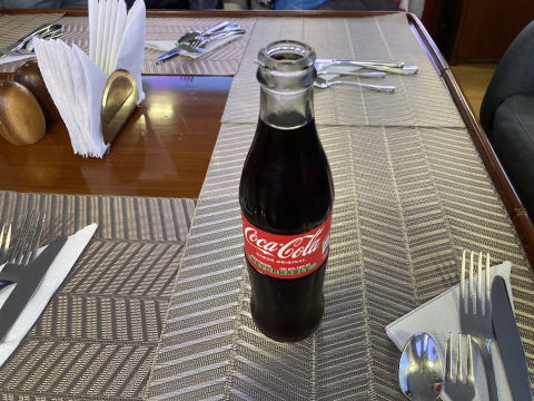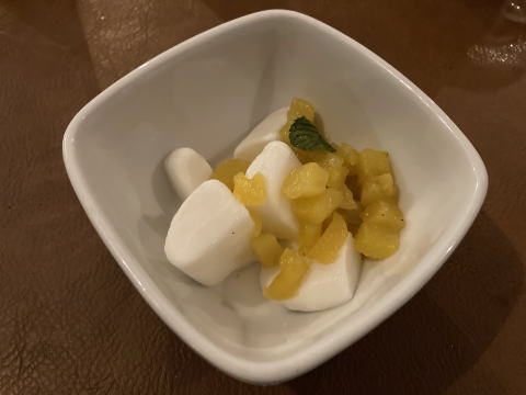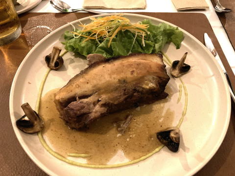 夕食のメインはサンタクルス島産豚肉のグレーズ仕立てだった。200g以上ある塊肉が皿に乗って登場した。硬くて食べにくいのではないかと思ったが杞憂だった。まるで角煮のような柔らかさでとてもおいしかった。デザートのココナッツシャーベットも絶品だった。