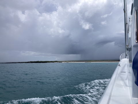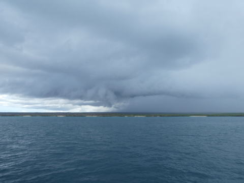 ノースセイモア島に滞在していた頃からサンタクルス島の上空には雨雲がかかっていた。バーチャスビーチ付近には雨柱が見えていた。