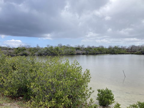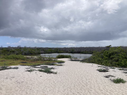 船上でシュノーケリングの準備を整えてゴムボートに乗りバーチャスビーチに上陸した。雨は降っていなかったが上空には低い雲が垂れ込めていた。まずビーチ裏手のラグーンを見に行った。運が良ければフラミンゴが見られる場所だ。だがこの日は不在だった。