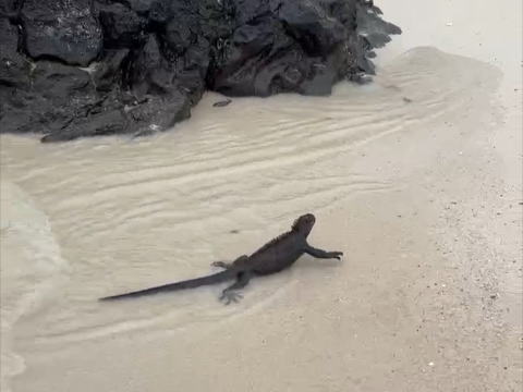 上陸地点は波が高かった。そこで波の影響を受けにくい岩場で囲まれたビーチまで300mほど砂浜を歩いた。途中の岩場にはウミイグアナの姿があった。