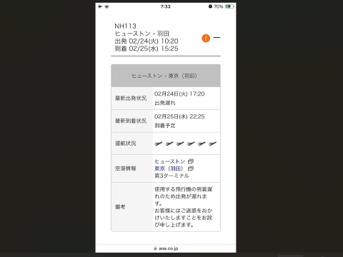 羽田空港到着は22時40分の予定だった。着陸時刻が近づいてくると羽田から自宅までの移動が気になってきた。到着が遅れたり預入荷物の受け取りに手間取ったりすると終電に間に合わない可能性が出てきたのだ。1分でも早く羽田に着いてくれと祈るような気持だった。