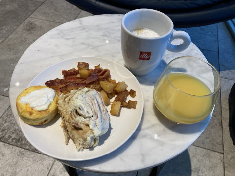 帰りもビジネスクラスだったのでユナイテッド航空のラウンジが利用できた。早速出国を済ませてラウンジに入った。居心地の良いラウンジだった。朝食の時間帯だったのでまずビュッフェスタイルの朝食をとった。食事も飲み物もおいしかった。その後はガラパゴスで撮影した画像を眺めたりWi-Fiを利用してネットを見たりして過ごした。