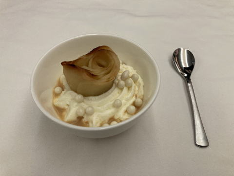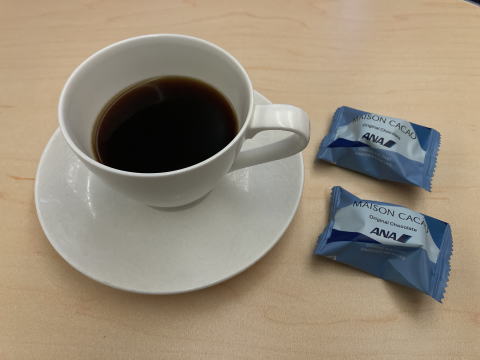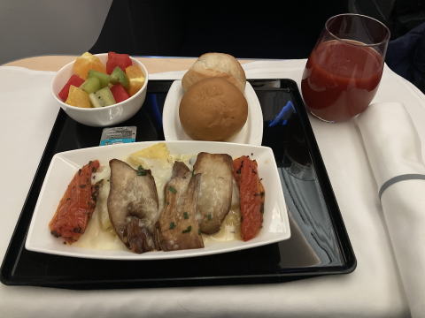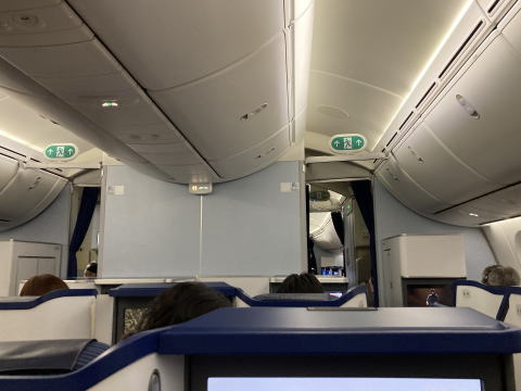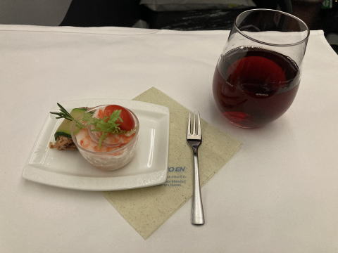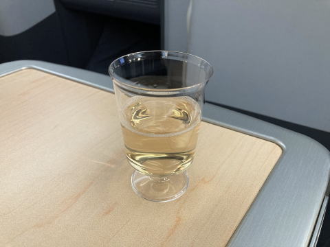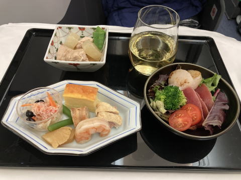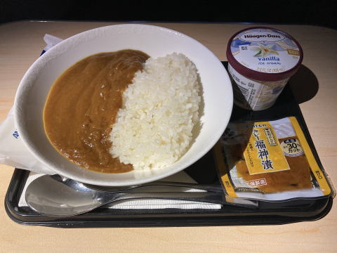 ビジネスクラスではいつでも軽食をオーダーすることができた。目が覚めたタイミングでヴィーガンカレーとアイスクリームをお願いした。精進料理店醍醐の料理長が開発した国産の野菜と果実だけで作ったヴィーガンカレーが物凄くおいしかった。その後着陸前にはラビオリがサービスされた。