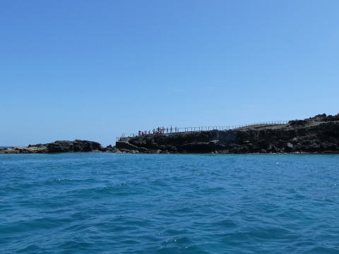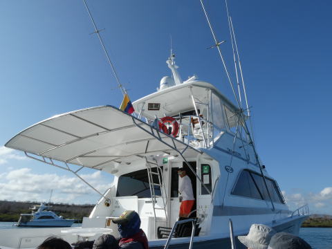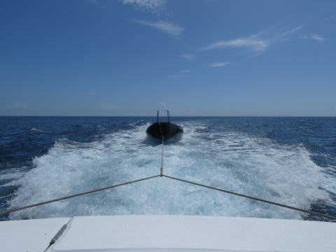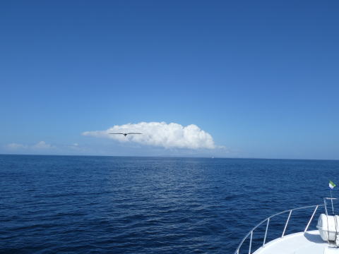 港の桟橋でゴムボートに乗り込んでクルーザーまで運んでもらった。クルーザーは思っていたより大きかった。眺めの良いトップデッキの椅子に腰掛けた。
