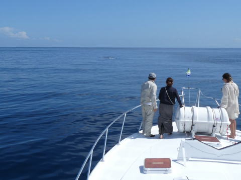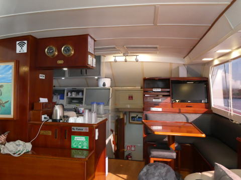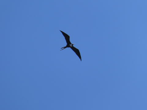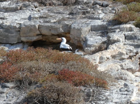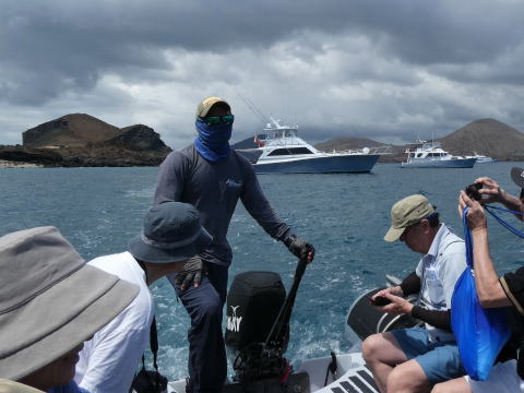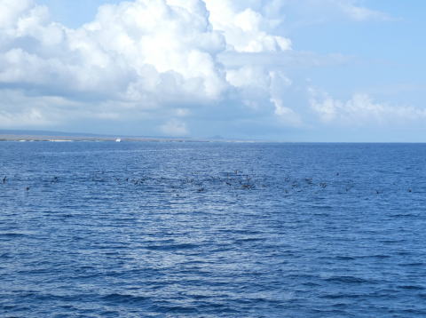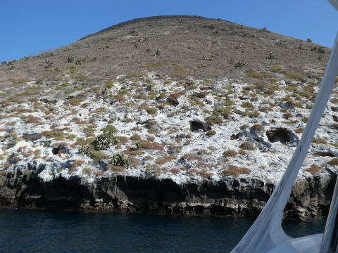航行時間は予定では2時間半ほどだった。航行中は海上を飛ぶ鳥や水面に浮かぶウミガメなどを見つけて楽しんだ。途中で大ダフネ島のすぐ横を通過した。島の斜面に営巣する鳥たちの様子が観察できた。