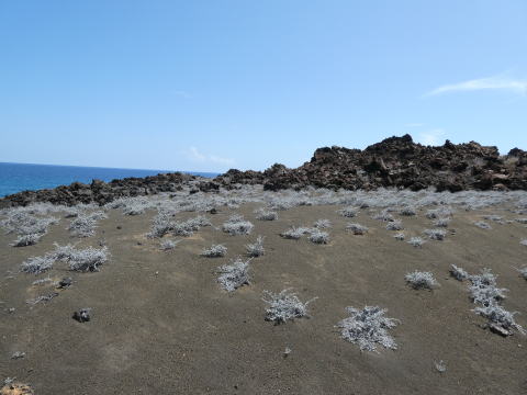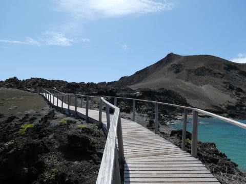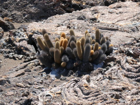 10時過ぎにバルトロメ島に着いた。島の沖にクルーザーを停めてゴムボートで上陸した。バルトロメ島は岩や地表が剥き出しになった荒涼とした島だった。所々にパイオニアプランツのティキリアが火山噴出物で覆われた大地にへばりつくように生えていた。