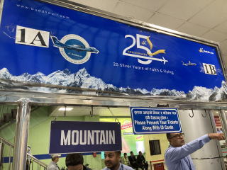 5時35分に空港に着いた。ネパールの空港はターミナルビルに入る際にセキュリティーチェックがある。セキュリティーチェックを受けて建物内に入りチェックインカウンターに並んだ。カウンターの行き先表示はMAUNTAINになっていた。