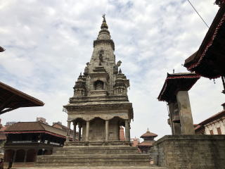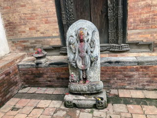 まずダルバール広場に向かった。途中で見かけた大きな菩提樹の根元にも祠があった。階段を上がり門を潜って旧市街に入り、さらに門を潜った先がダルバール広場だった。バクタプルのダルバール広場はカトマンズのダルバール広場より小規模で落ち着いた雰囲気だった。