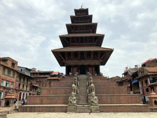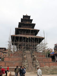 その後はトウマディー広場に向かった。ダルバール広場から200mほどだった。広場に面してカトマンズ盆地一の高さを誇るニャタポラ寺院が建っている。高い前回の訪問時は足場に覆われていたが修復が完了して荘厳な姿を見せてくれていた。