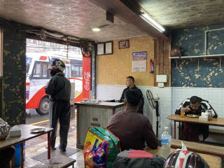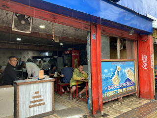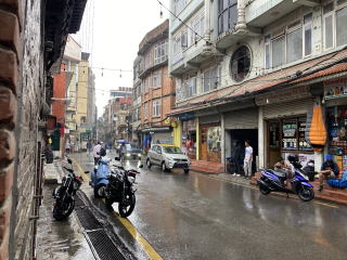 雨はまだ降っていたがお腹が空いていたので昼食をとりに外出することにした。ローカルなモモが食べたいとウジュンにリクエストしたところタメル地区の北にある人気店に連れて行ってくれた。ホテルから5分ほど歩いた。バフモモ(水牛のモモ)しかメニューがないモモの専門店だった。