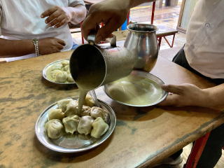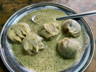 入口で食券を買って着席すると店員が皿に盛られたモモをすぐに持ってきた。そして特製のソースをたっぷりかけてくれた。肉の旨味が詰まったモモとヨーグルト風味でスパイスの効いたソースとの相性が抜群だった。一人前の10個では足らず5個追加注文した。