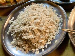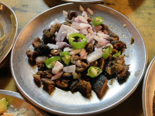 店の一番奥の席に荷物を置いて入口横の台に置かれた料理を見に行った。肉や魚介、野菜などを使った料理が並んでいた。中には何が入っているのか見当がつかないものもあった。食べたいものを何品かウジュンに伝え他はウジュンに選んでもらった。