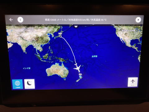 搭乗機は予定より少し遅い19時30分に成田空港を離陸した。オークランドまでの飛行時間は10時間超だ。離陸直後にサービスされた夕食を食べた後は朝食のサービス開始まで寝て過ごした。