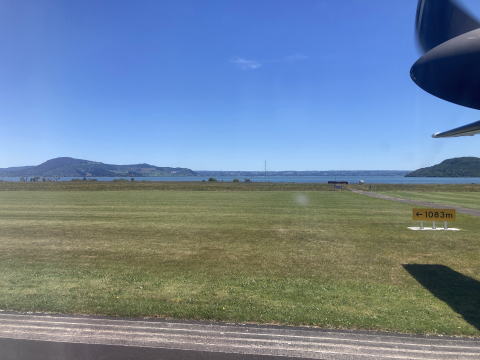 滑走路の奥はロトルア湖だ