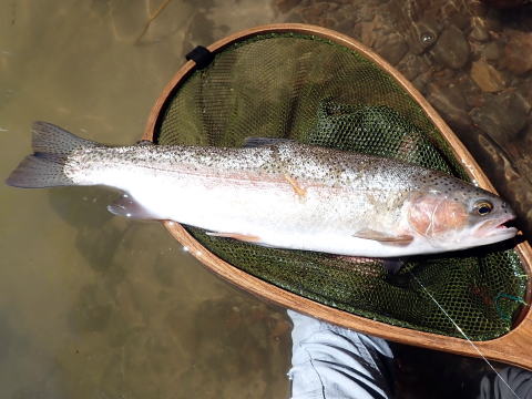 その次にかかった魚は引きが強かった。川を下ってファイトすることができないので下流に走られないように注意してファイトした。ランディングできたのは40cmオーバーのレインボートラウトだった。増水の悪コンディションでこのサイズの魚が釣れてとても嬉しかった。