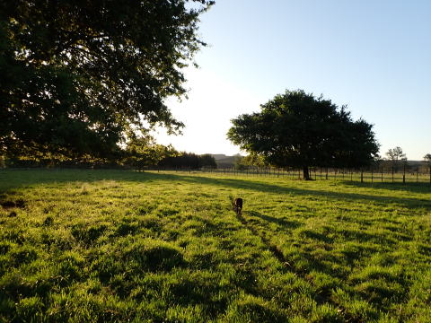 夕食後はマリーの家の裏を流れているR川でイブニングの釣りを楽しむことにした。現地はサマータイムを実施していることもあり21時過ぎまで釣りができる。19時30分にマリーの家を出て川に向かった。マリーの家と川の間は牧場になっている。ラッキーと一緒に牧場の中を10分ほど歩いて川に着いた。