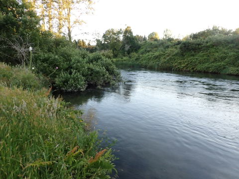 R川も水が多かった。イブニングライズは灌木の下流で起きることが多い。河岸に生えた何本かの灌木の下流部の様子を見て回りながらライズが始まるのを待った。