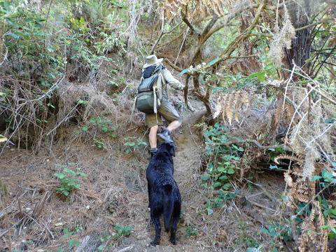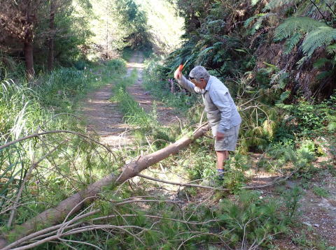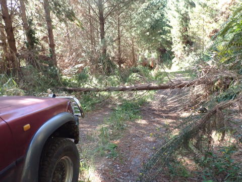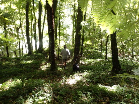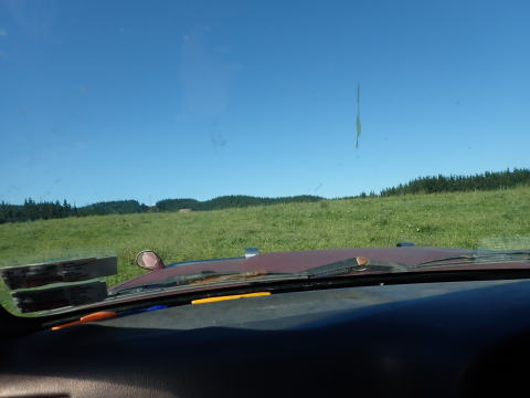 釣り場までは1時間半ほどかかった。舗装路から牧場へと続く砂利道に入り、さらに牧草地を抜けて廃道となった林道を通って入渓点を目指した。林道を進んでいくと倒木が道を塞いでいた。マリーが鉈で倒木を切って通路を確保した。そこから200m程進むとさら太い倒木が道を塞いでいた。ここからは歩いて入渓点を目指すことにした。