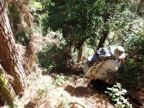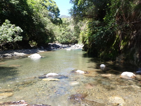 釣り支度を整え入渓点まで林道を10分程歩いた。そこから林の斜面を降り、最後は崖に近い急斜面を20mほど下って川に着いた。川の雰囲気は以前来た時と同じだったが水量は多めだった。