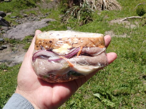 時刻はちょうど12時だった。昼食をとることにした。河原で食べるサンドイッチがおいしかった。