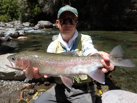 夕食後は前日の午後釣りをした瀬にイブニングの釣りに出かけた。ライズは見られなかったが暗くなる前にドライフライで35cmほどのレインボートラウトを釣ることができた。