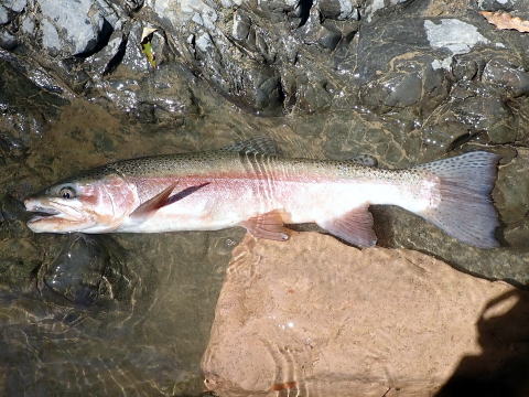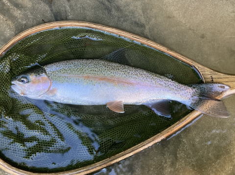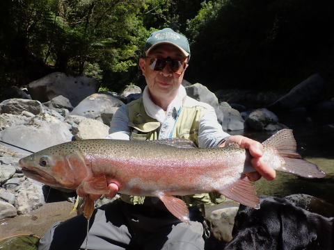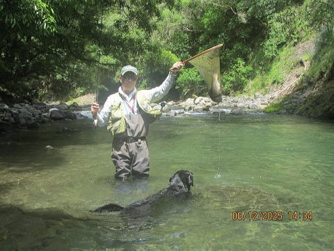 遡行していくと瀬の中央部の深みに魚影が見えた。慎重に下流に回り込んでドライドロッパーの仕掛けで狙った。数投目に魚のいる流れにフライが乗った。するとごく自然に魚が浮上してフライを咥えた。一呼吸置いて合わせるとずっしりとした手応えが返ってきた。下流に走られないよう気を配りながらファイトしてネットに収めた。この日のファーストフィッシュは50cmのレインボートラウトだった。マリーとがっちり握手を交わした。