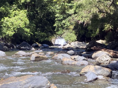 やがて上流に滝が見えてきた。この川で最初に釣りをした時、滝下のプールで美しいレインボートラウトをキャッチした思い出深い滝だ。水位が高くてそのプールまでは行けなかったが遠くからでも滝を眺めることができて嬉しかった。
