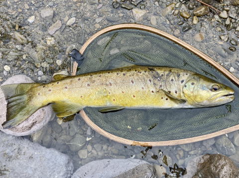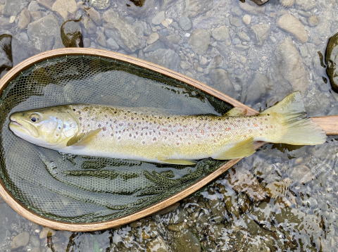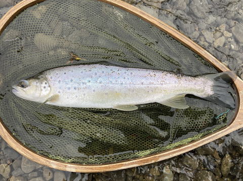 この状況なら合流点で釣りをするより川で釣りをした方が釣果を期待できるかもしれないと考えた。もう一度同じポイントを狙うと対岸際を流したマーカーが勢いよく消し込まれた。合わせると重たい手ごたえが伝わってきた。ファイトを始めると魚の挙動が先ほどの魚とは違った。魚体も黄色っぽく見えた。ブラウントラウトだった。慎重に寄せてネットに収めた。48cmある良型魚だった。
