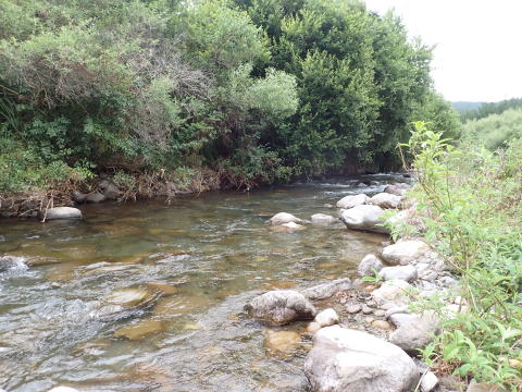 さらに500mほど釣り上がったがその先は浅くて平坦な流れが続いていてめぼしいポイントは見当たらなかった。時間も限られていたので橋まで戻って本流との合流点まで釣り下ることにした。