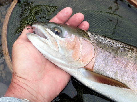 この魚をリリースして再びプールの様子を確認すると先ほどと同じ場所に魚影がまた確認できた。別の魚が同じ場所に移動してきたようだ。この魚も1投目でフライに反応した。今度の魚は52㎝ある良型のレインボートラウトだった。