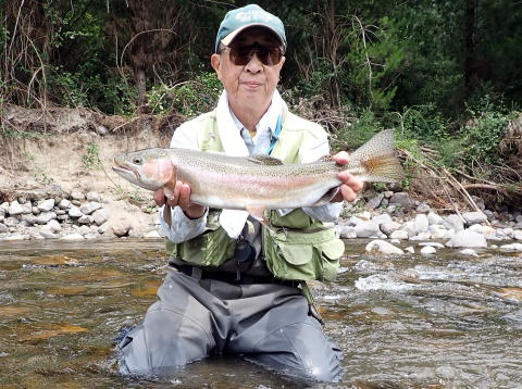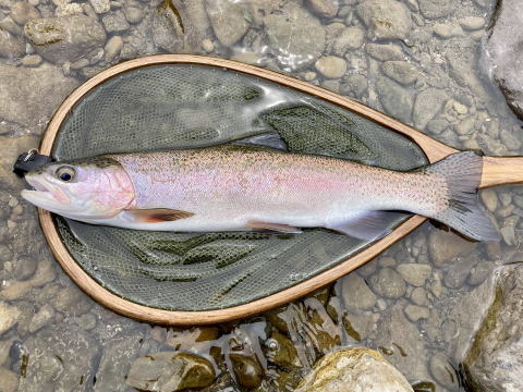 時刻は12時だった。そろそろ釣りを終えなければいけない時刻だ。合流点から橋まで戻り最後に橋下のポイントにキャストした。するとまたアタリがあった。しかもかかった魚はかなりの良型だった。この魚をキャッチして今回の釣行を締めくくりたいと思った。気を引き締めてファイトした。数分のファイトでネットに収まったのは57㎝あるレインボートラウトだった。今回の釣行の最大魚を最終日のラストキャストで釣ることができてとても嬉しかった。セルフタイマーを使って写真を撮り、魚を優しく流れに戻して釣り場を後にした。