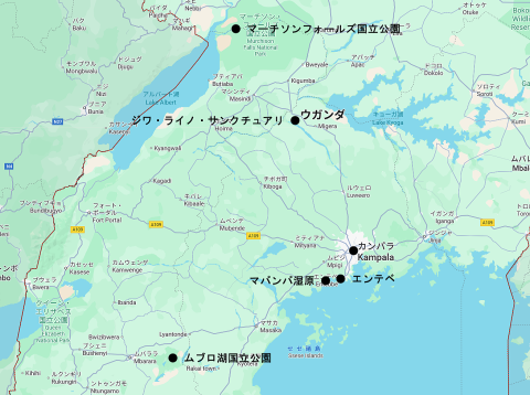今回は釣りもあくまでアクティビティーの一つと考え、ゲームドライブ(いわるゆサファリ)を中心にした旅行プランを立てることにした。これまでは釣り場となるマーチソンフォールズ国立公園しか訪れたことがなかったので他の国立公園にも行ってみたいと思った。首都のカンパラからそう遠くないムブロ湖国立公園を候補に挙げた。ここでは通常のゲームドライブ以外にボートや乗馬、徒歩などで動物を見て回ることができる。またマーチソンフォールズ国立公園には生息していないシマウマやインパラが生息している。上記二つの国立公園以外ではマーチソンフォールズ国立公園とカンパラの間にあるシロサイの保護繁殖施設のジワ・ライノ・サンクチュアリと、エンテベ空港の近くにあるハシビロコウが生息するマバンバ湿原を再訪することにした。