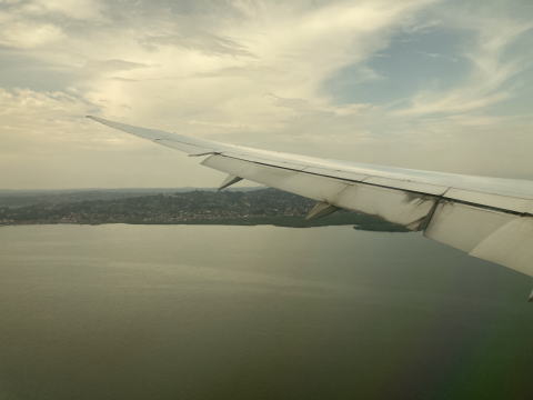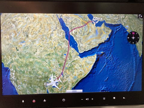 搭乗機は10時30分にドーハ空港を離陸した。離陸直後はドーハ市街や一面に広がる砂漠の様子を機窓から眺めることができた。その後サウジアラビア、紅海、エチオピアの上空を飛行して15時にエンテベ空港に着陸した。